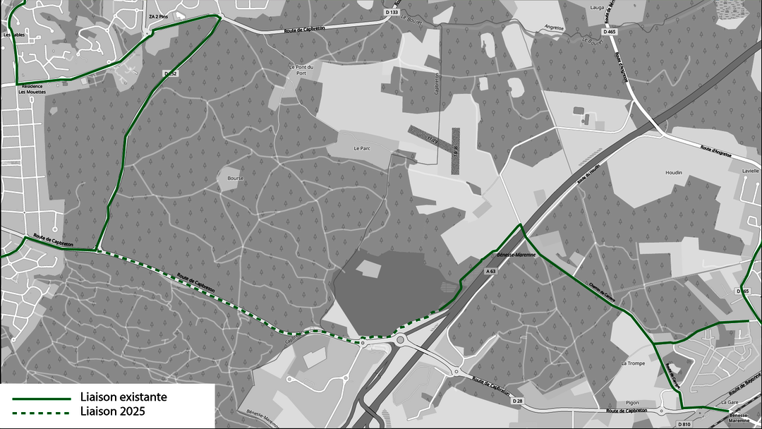 Cette piste cyclable entre Bénesse-Maremne et Capbreton vise à offrir une alternative sécurisée et pratique pour se déplacer à vélo sur un axe majeur du territoire. Elle répond à une demande croissante des habitants, notamment dans un contexte de route départementale très fréquentée, avec plus de 10 000 véhicules par jour. Elle facilite les nombreux déplacements domicile-travail de cette voie, en reliant également des lieux stratégiques comme l'autoroute, la gare de Bénesse-Maremne, une zone d’activité et une zone commerciale. Un passage sous l’A63 permet de surcroit d’améliorer significativement la sécurité et le confort des cyclistes (versus pont autoroutier).