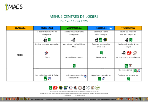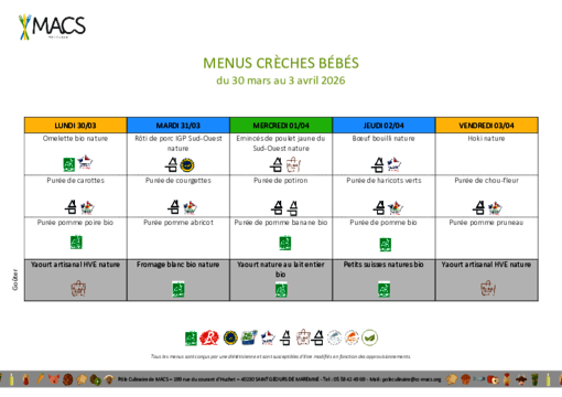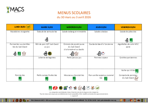 Les menus proposés par le Pôle Culinaire de MACS
