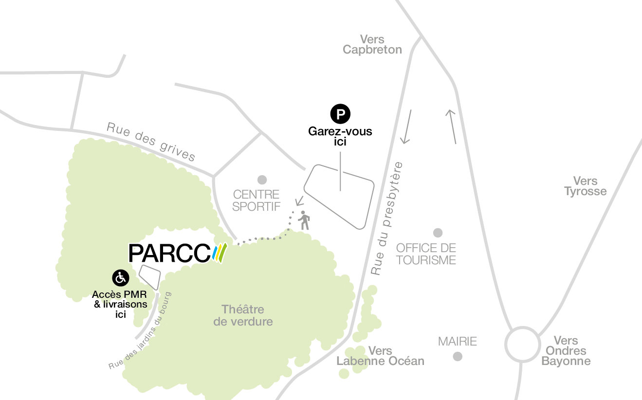 Pour les personnes à mobilité réduite, des places de stationnement sont accessibles au sein même du PARCC, rue des jardins du bourg, via la rue de Bellocq.