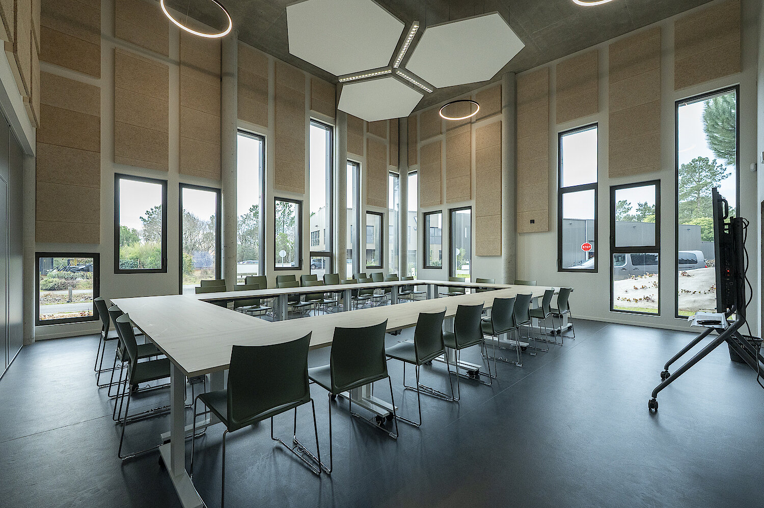 - Salles de réunion/formation : 23 m², 30 m², 65 m², 118 m²
