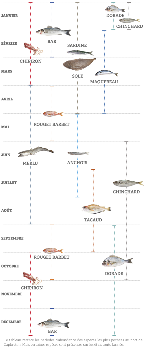Vous trouverez toute l’année sur les tables de vente du poisson de saison, pêché localement et d’une fraîcheur inégalable. Passez aussi vos commandes de poisson, achetez sur place ou faites-vous livrer. Retrouvez les coordonnées de vos pêcheurs pour consommer la pêche locale sur notre annuaire.
