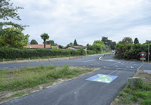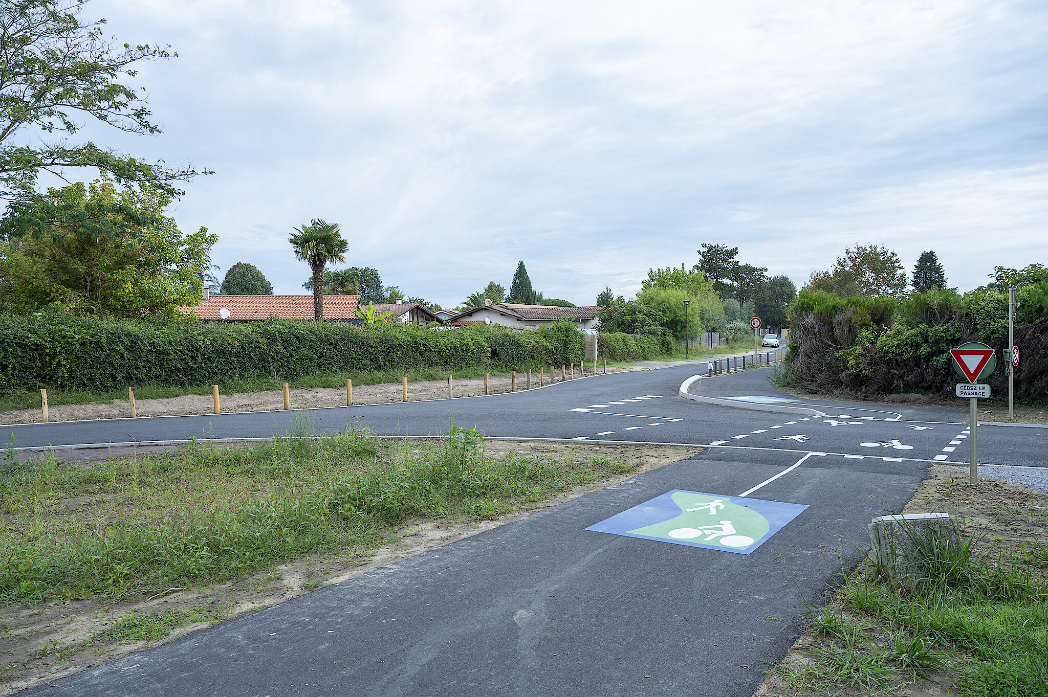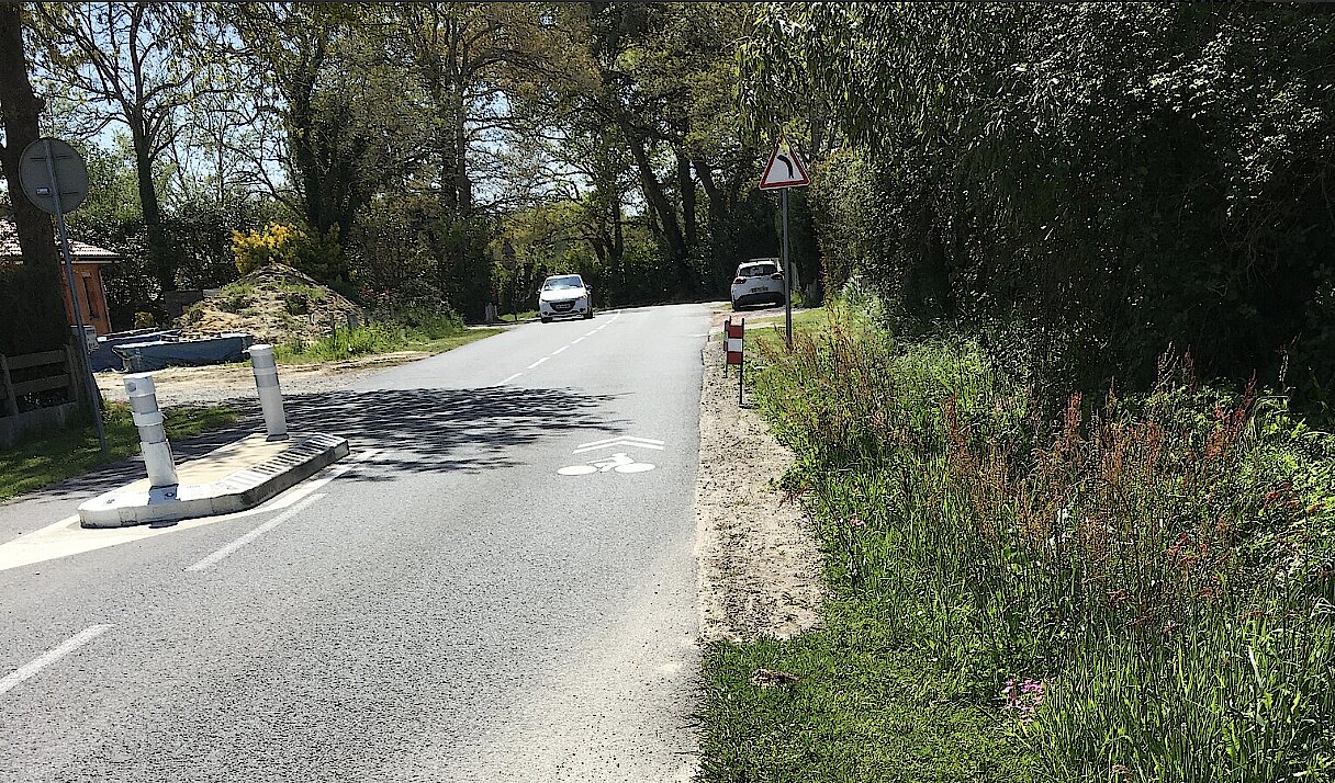 Aménagement de la rue d’Amaniou, de l’allée des Sports et liaison cyclable vers arrêt bus. La voie actuelle était une voie d’environ 6 m de large bordée d’accotements enherbés et ponctuellement de grave. Il n’existait ni trottoir ni voie cyclable.