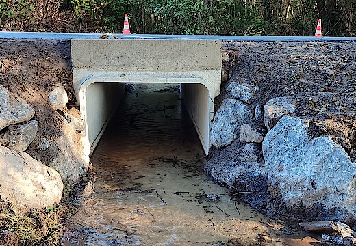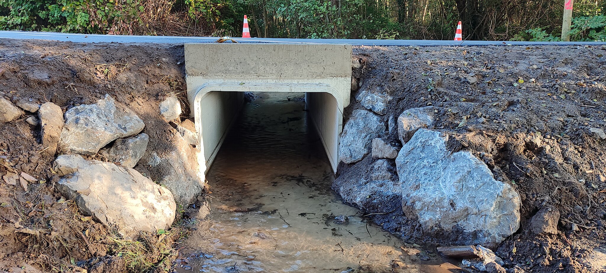 - Remplacement de l’ancien pont en dalle de schiste, fragilisé par le temps, par un pont cadre en béton armé, garantissant la sécurité et la durabilité de l’ouvrage