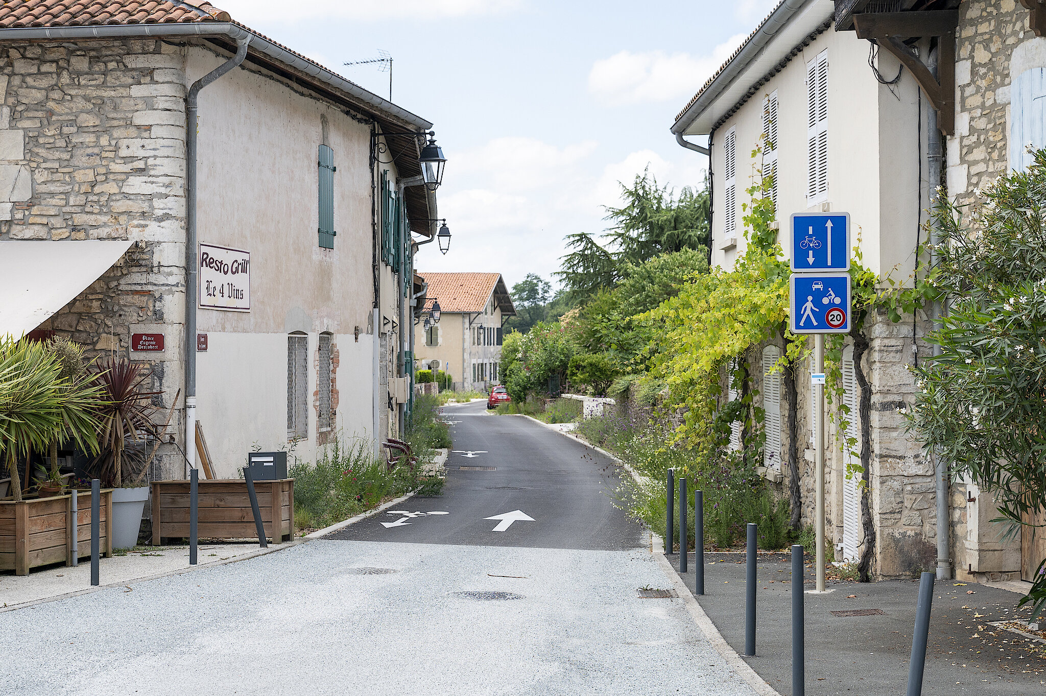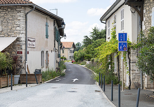 Aménagement de la rue du lavoir en zone de rencontres (zone 20). Dans cette zone, les piétons sont autorisés à circuler sur la chaussée et bénéficient de la priorité et la vitesse des véhicules y est limitée à 20 km/h. Des plantations ont été réalisées avec les élèves de l'école pour végétaliser les abords de la chaussée et favoriser l'infiltration de l'eau dans le sol.